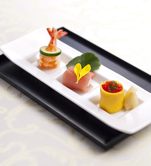 有頭海老黄身寿司射込み 磯つぶ旨煮